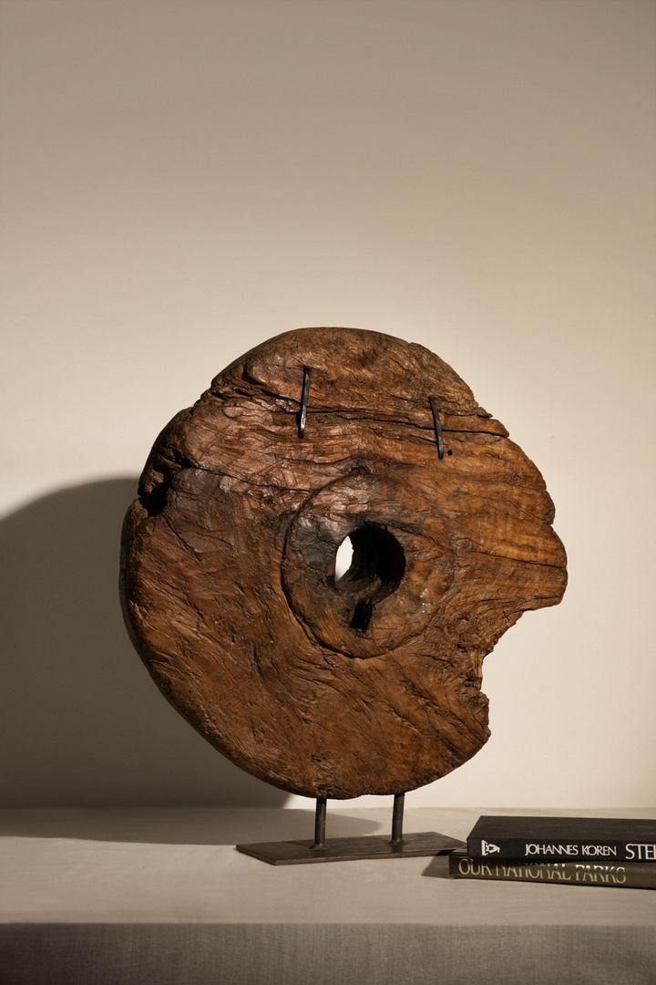 Kinowa whispers of a time when life flowed with the seasons. When wooden wheels carried harvests and turned slowly to grind spices and press oil. Mounted on a simple metal stand, it holds the legacy of hands that shaped the land. A piece to inspire new stories in every modern home and invite the next generation to listen, wonder, and remember.