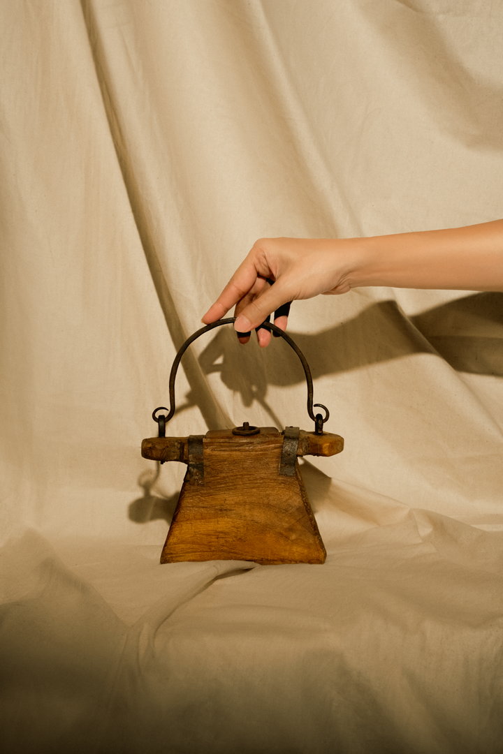 Once a humble oil pot, now a sculptural accent with the charm of a vintage handbag. Crafted from natural wood, the Taila Pot brings rustic warmth and a playful nod to tradition.Display solo or with kitchen antiques to spark curiosity and conversation.